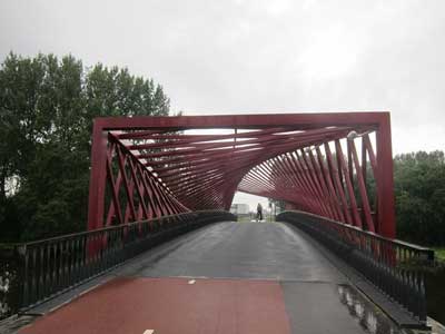 Bentuk jembatan biasa dihiasi semacam perisai tiga dimensi berwarna  merah yang selain melindungi pejalan kaki, juga membuatnya sedap  dipandang. Dibuat dari 400 potongan baja yang kemudian diproses kimiawi  yang ketat, membuat jembatan ini berdiri kokoh dan mungkin takkan rubuh  hanya dalam 10 tahun!